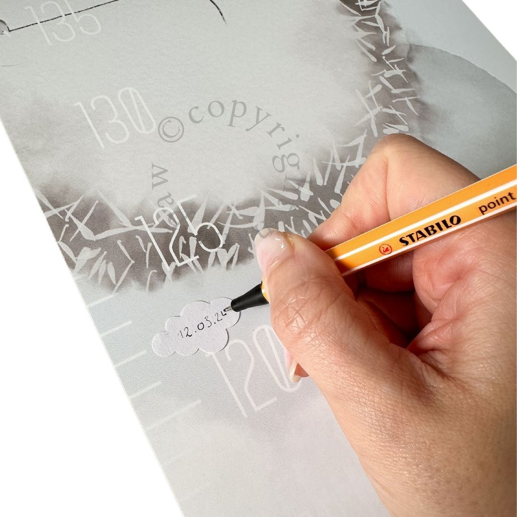 Passend zum Design gibt es einen Stickerbogen mit Wölkchen verschiedener Größen und Formen, die sich mit jedem Stift beschriften lassen. So kannst Du die Entwicklung ästhetisch und stilvoll festhalten.