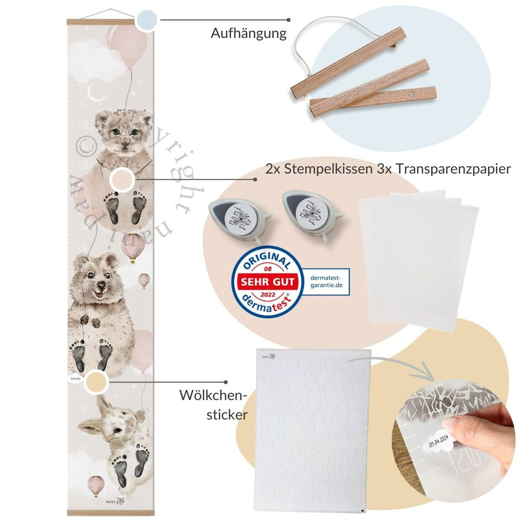 Enthalten ist außerdem der passende magnetische Posterhanger, sodass Du das Poster direkt aufhängen kannst. Für die Abnahme der Fußabdrücke gibt es eine Anleitung sowie zwei Stempelkissen und drei Transparenzbläter zur Übertragung.