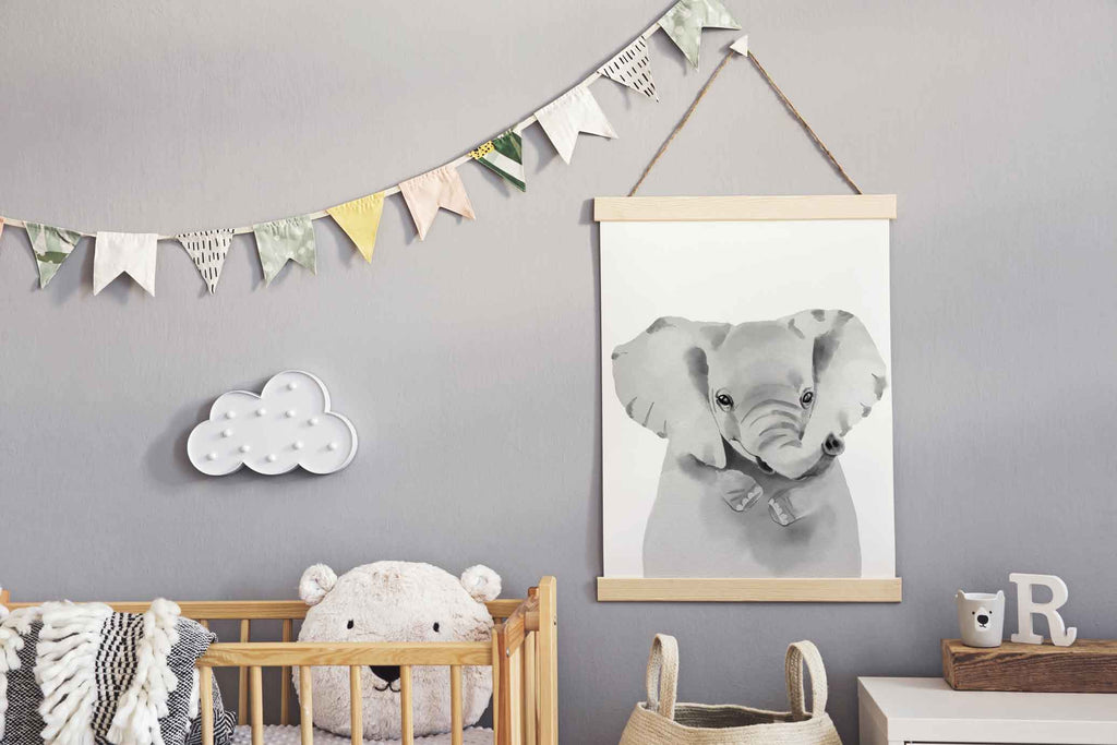 Das Elefantenbaby passt aufgrund seiner dezenten Farbe in jedes Kinderzimmer, von Boho bis bunt.